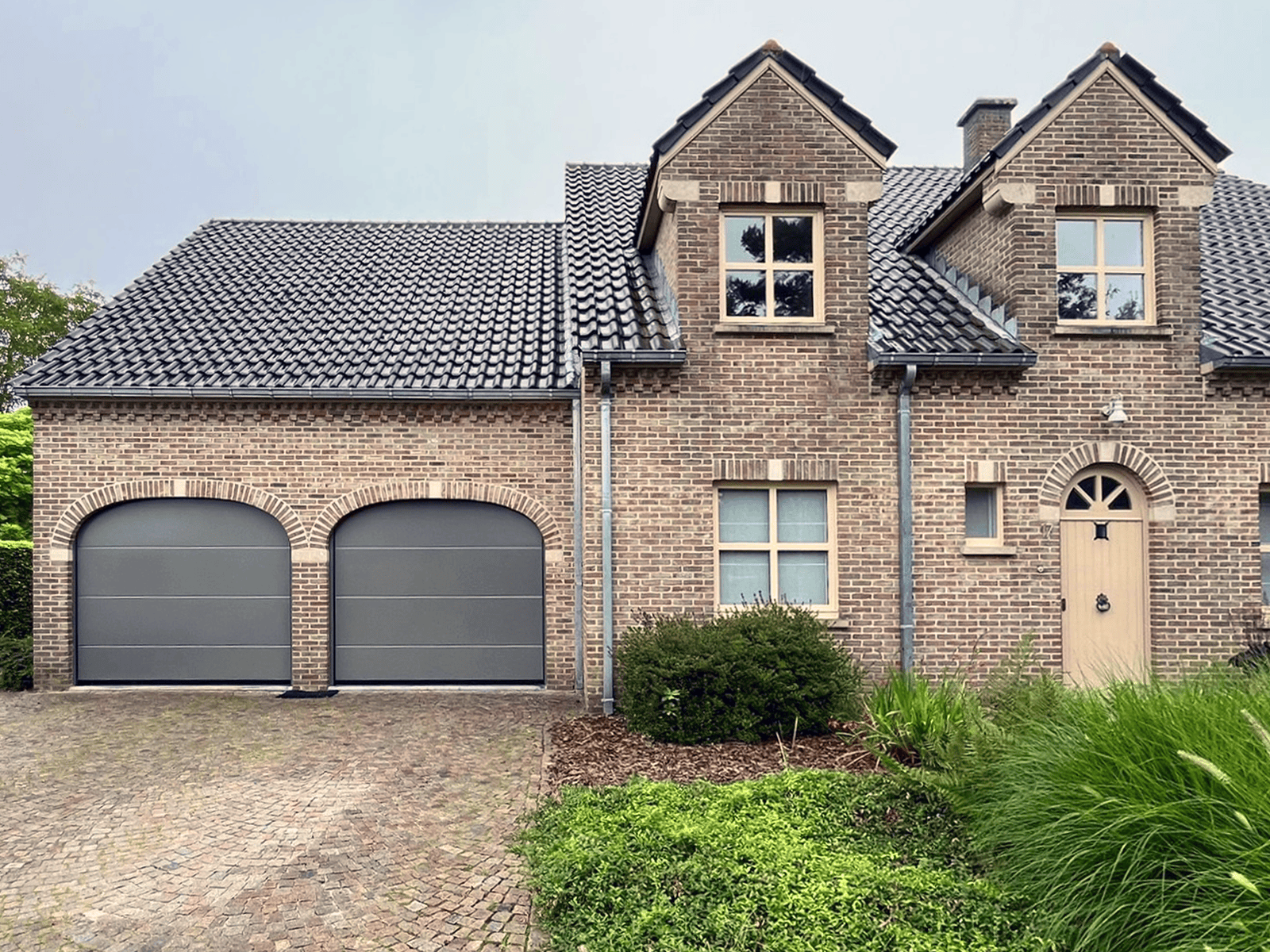 Deze dubbele grijze sectionaaldeuren vormen een stijlvol element in deze klassieke woning.