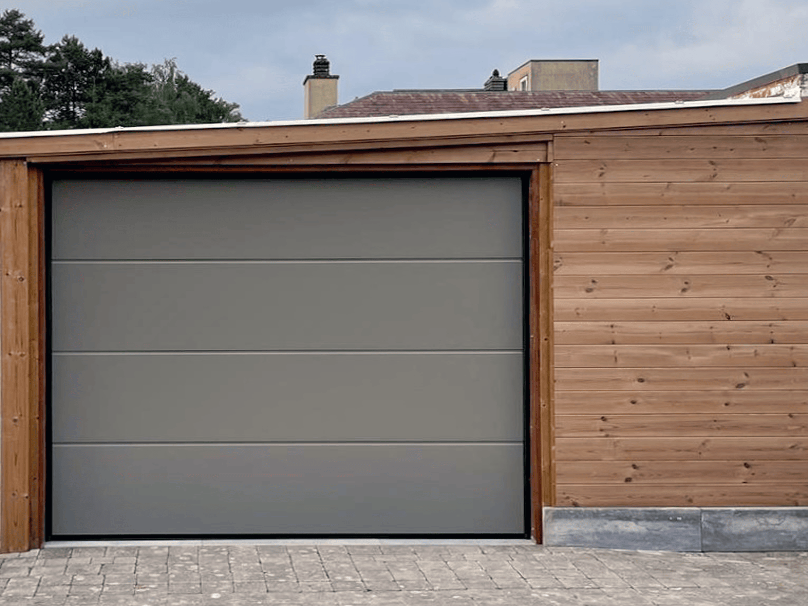 Grijze sectionaaldeur met houten gevel – Natuurlijk en modern
