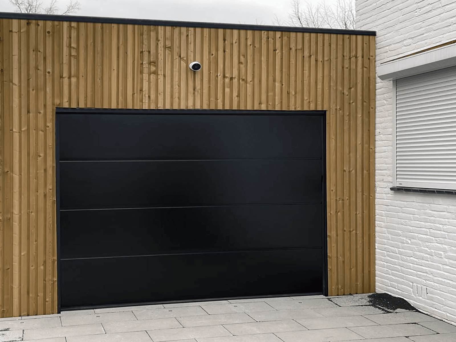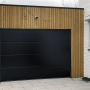 Deze grote zwarte sectionaaldeur is ideaal voor garages met brede ingangen.