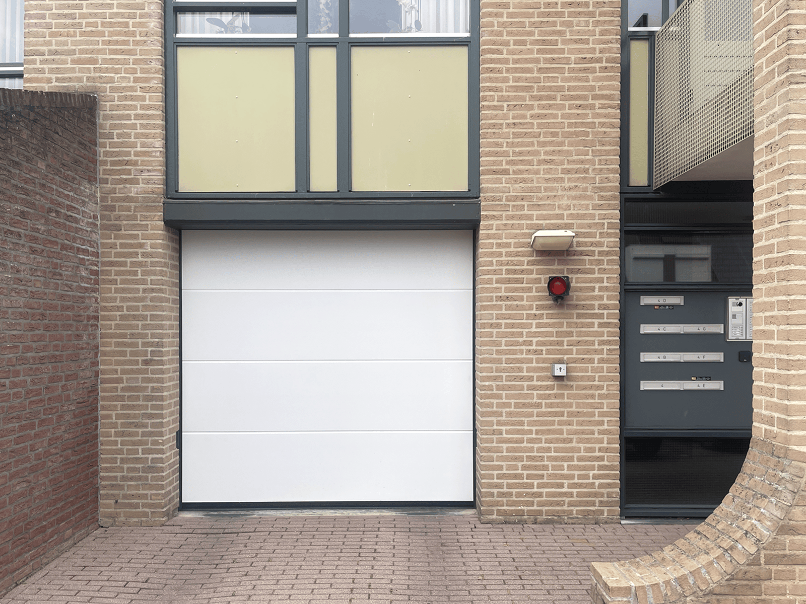 Witte sectionaaldeur in stedelijke omgeving